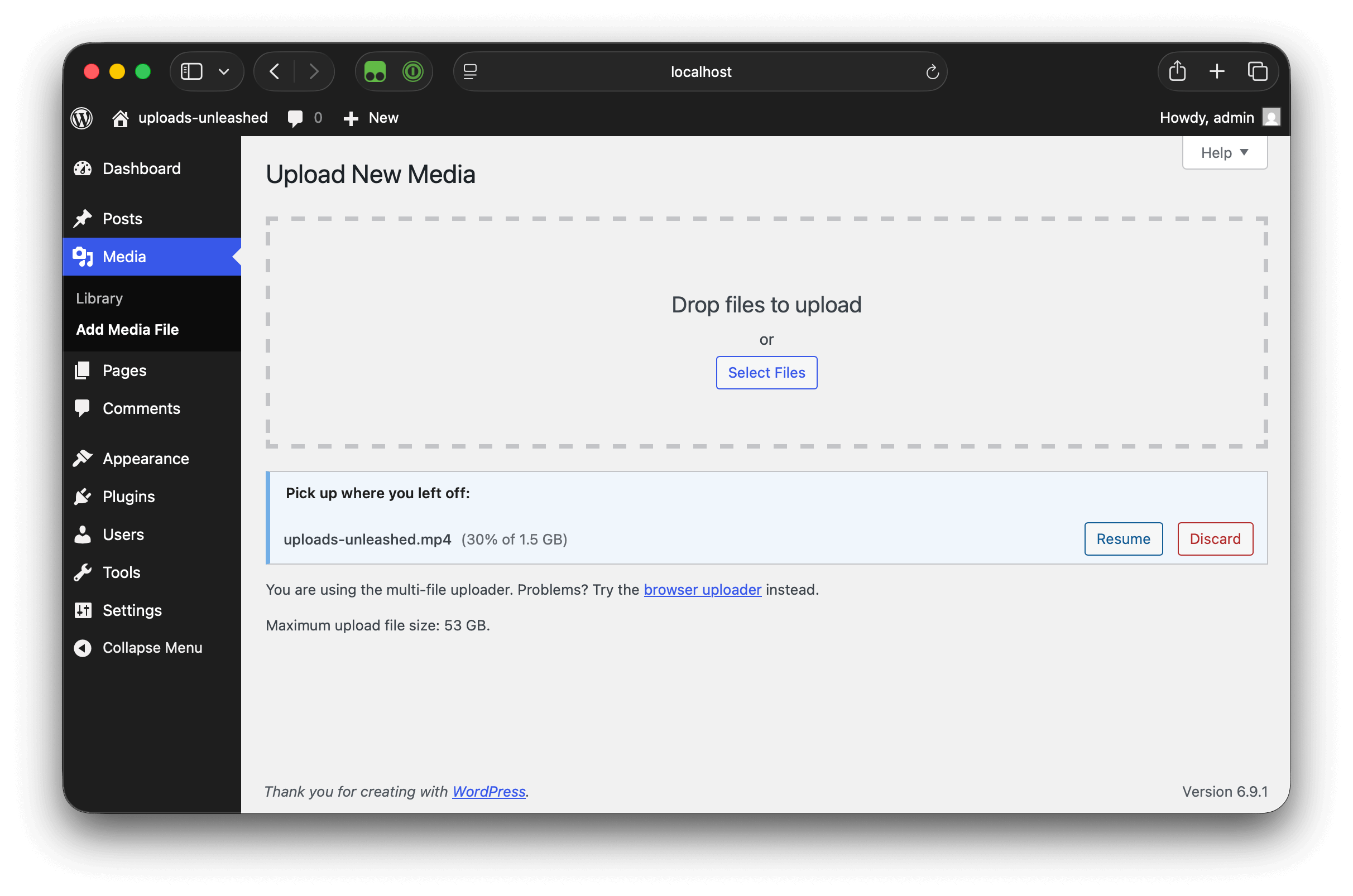 If you’ve ever hit the upload size limit in WordPress, you know how annoying that is. Uploads Unleashed removes that ceiling. Once activated, your upload limit jumps to whatever free disk space you have, in the screenshot below that’s 53 GB.